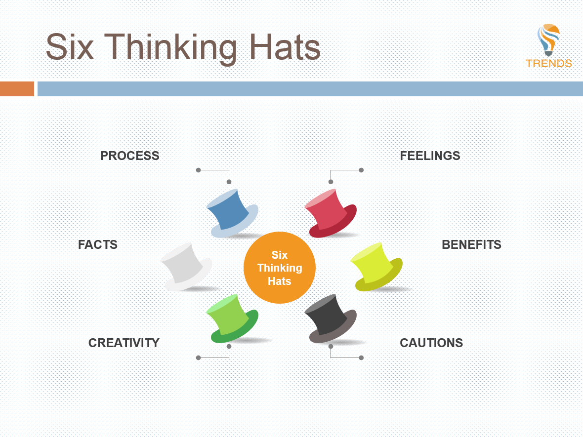 Ein Ausgangspunkt der Methode liegt in der Annahme, dass das Gehirn in unterschiedlichen Weisen denkt, die bewusst angesteuert werden können, und somit in einer Diskussion zu bestimmten Zeiten eingesetzt werden können. Man geht davon aus, dass es zu Kommunikationsschwierigkeiten kommt, wenn eine Person beispielsweise gerade ihre Gefühle zu etwas äußert und daraufhin eine andere analytisch an die Problemstellung herangeht.