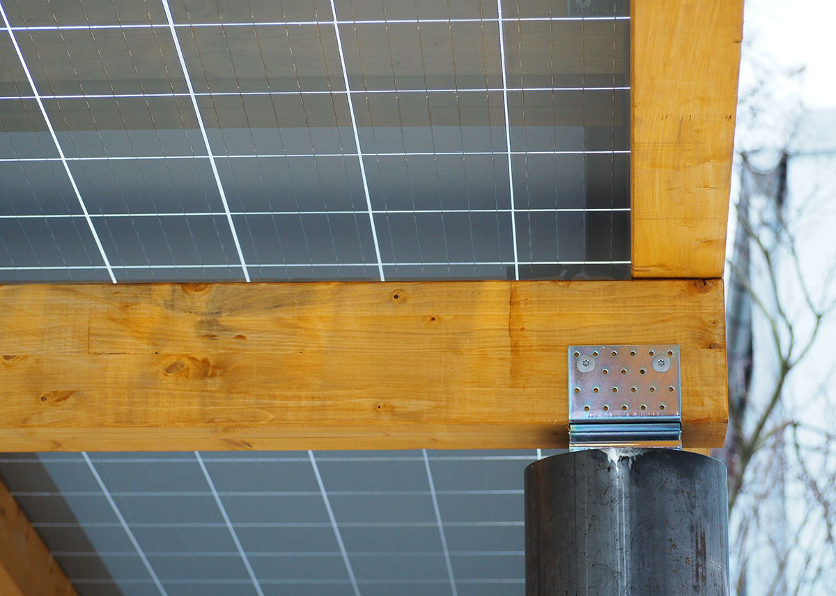 - Komplett in Holz oder in Kombination aus Holz & Stahl, wo die Solarmodule auf einer Holzkonstruktion liegen, die mit Stahlsäulen ausgestattet sind.