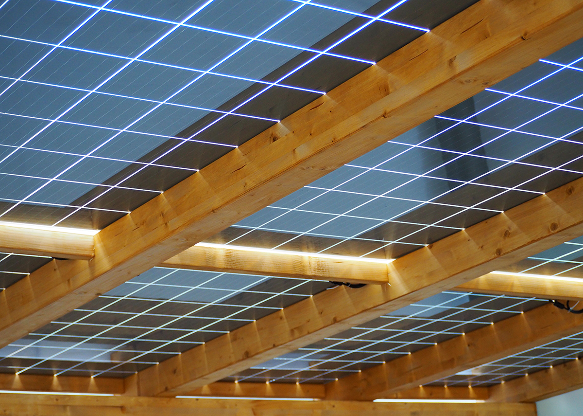 Smarte Lösung: Die Kombination aus Holz und Stahl und semi-transparenten Solarmodulen