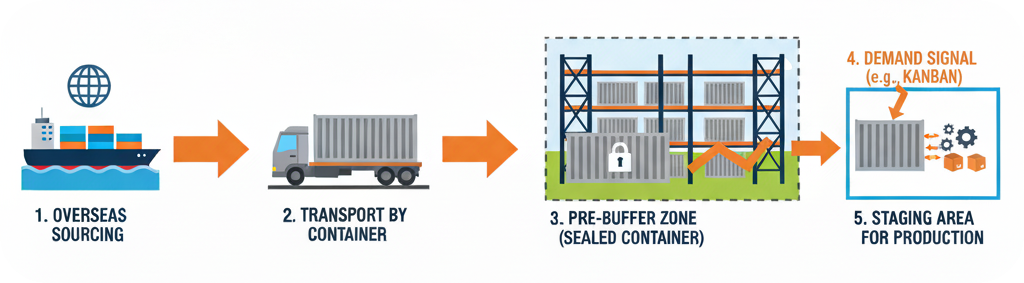 Produktionsteile aus Übersee per Container über Land aufs Firmengelände ungeöffnet in die Vorpufferzone und erst bei Bedarf die Produktionsteile aus dem Container ins Bereitstellungslager übergeben